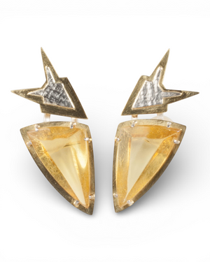 • Ohrschmuck mit Bernsteinen. Die aus dem Baltikum stammenden Edelsteine strahlen in einem transparenten Goldgelb. Die besondere Form der Bernsteine wird durch die außergewöhnliche Fassung zusätzlich betont. Oberhalb der Bernsteine zeigt sich die unverkennbare Formsprache des Künstlers, die sich durch prägnante Formen und feine Belötungen auszeichnet. 750 Gold- und Goldschmiede Krack-Stempel auf der Rückseite.