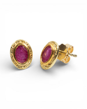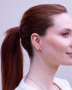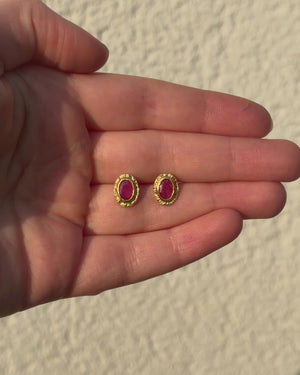 Kleine Ohrstecker aus 750 Gold mit Rubinen. Die oval facettierten Rubine zeigen ein intensives Pink-Rot und sind jeweils in eine handgearbeitete Feingoldfassung eingesetzt. Die fein strukturierte Oberfläche des Goldes verleiht den Ohrsteckern eine lebendige, organische Wirkung. Durch ihre kompakte Größe eignen sie sich ideal für den Alltag und lassen sich vielseitig kombinieren. Goldschmiede Krack sowie 750 Gold-Stempel auf der Rückseite.