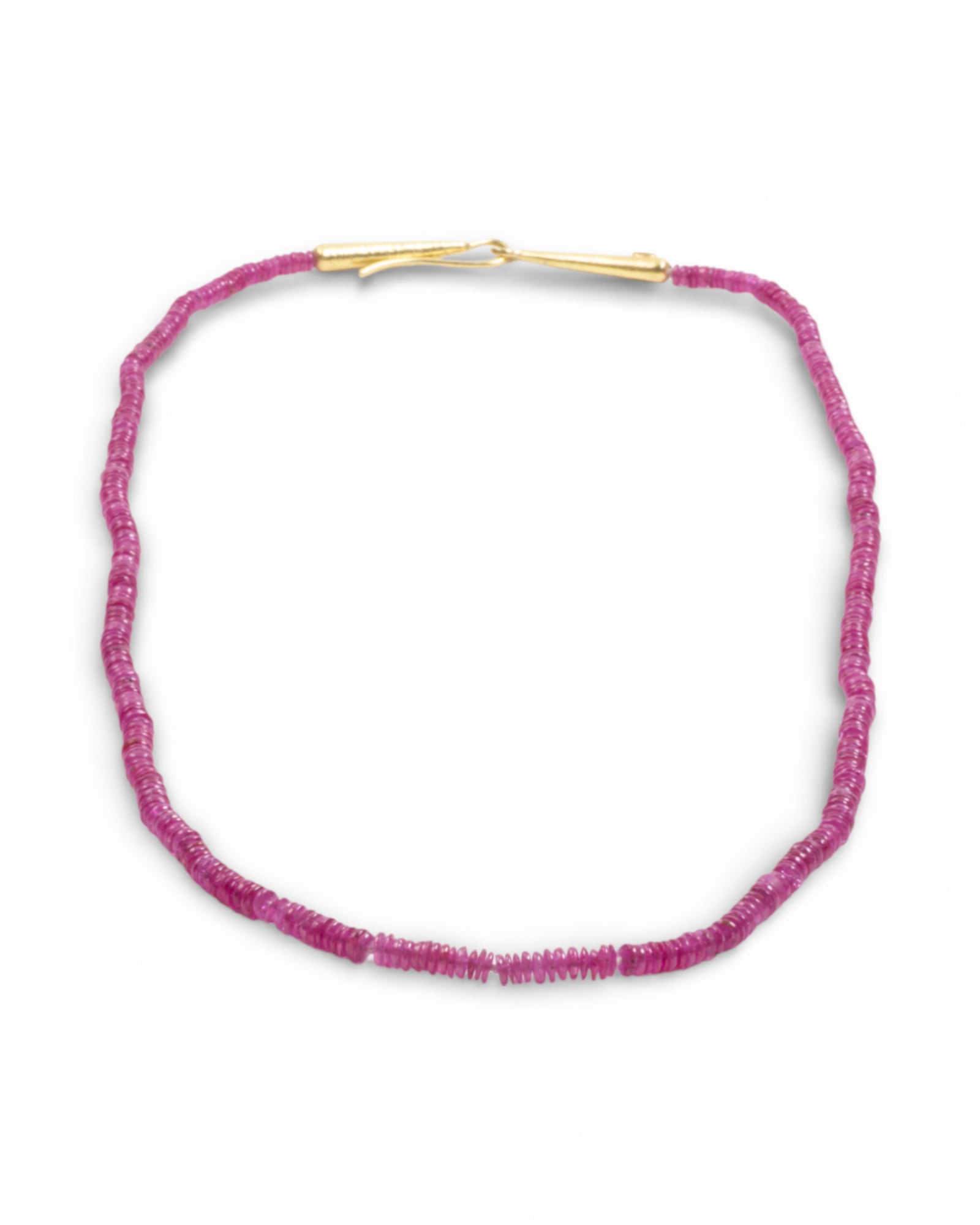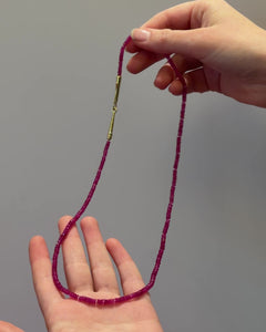 Rubin-Halskette mit insgesamt 65,80 ct Rubinen und einem handgefertigten Verschluss aus 750 Gold. Die Rubine sind fein abgestimmt und ergeben ein lebendiges Farbband, das sich angenehm trägt und solo genauso gut wirkt wie im Layering. Der warme Goldton des 750 Gold Verschlusses setzt einen ruhigen, hochwertigen Akzent und macht die Kette alltagstauglich und sicher.