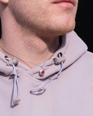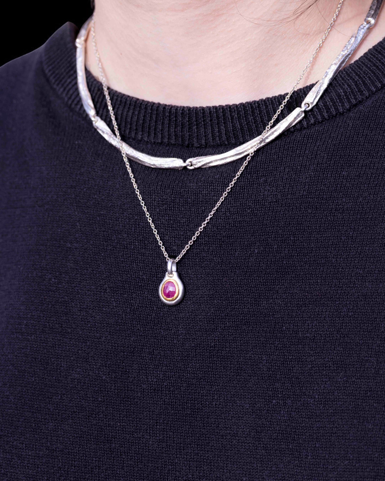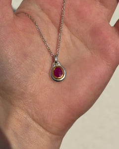 925 Silberanhänger mit Rubin (1,28 ct) und Goldfassung als Ketten-Bundle. Der Rubin ist oval facettiert und in eine handgearbeitete Goldfassung eingesetzt, die den warmen Farbton des Edelsteins betont. Der Anhänger wird im Set mit einer 925 Silberkette geliefert, wahlweise als Ankerkette oder Panzerkette. 925 Silber Stempel auf der Rückseite.