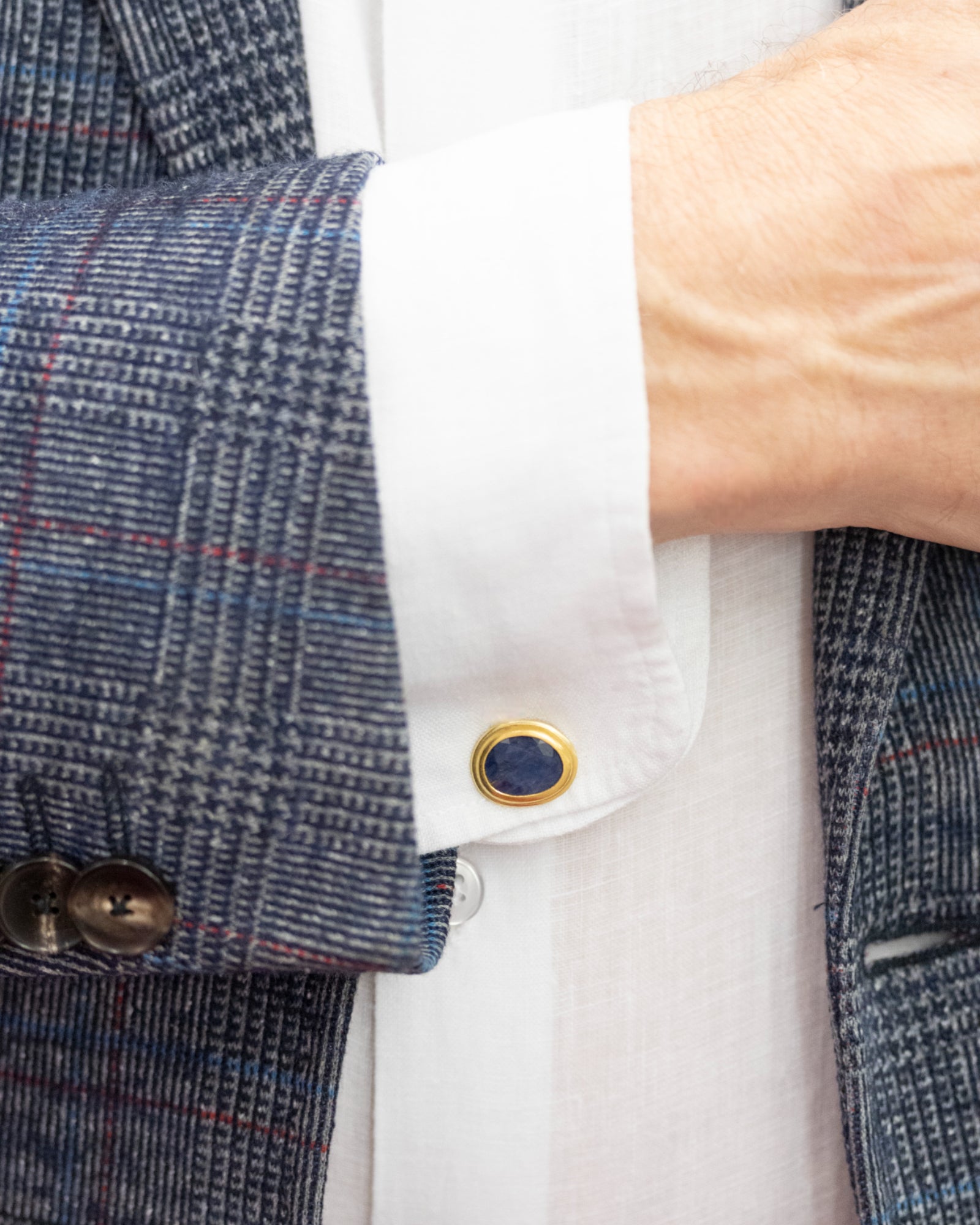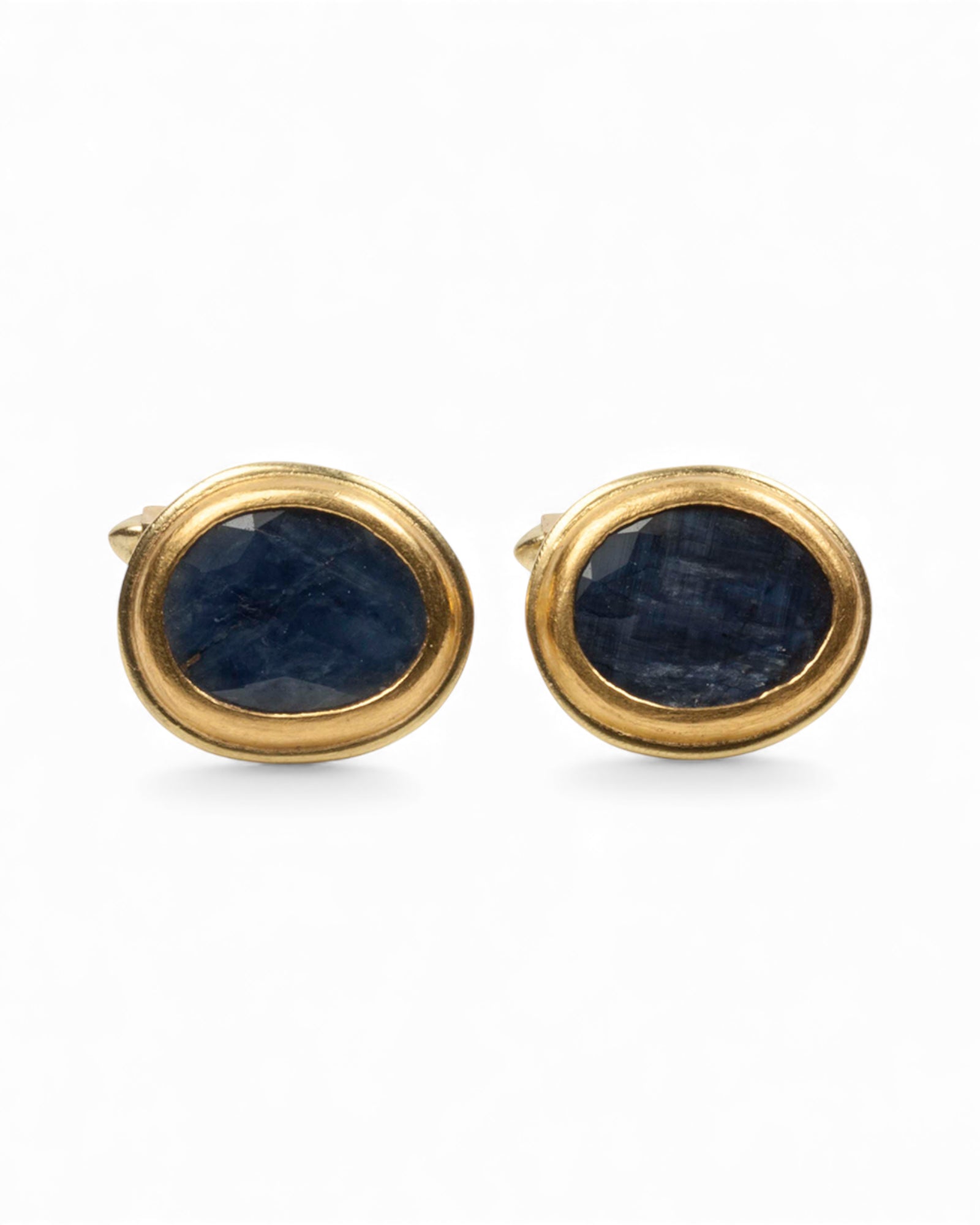 Manschettenknöpfe mit Saphir. Durch seine Facettierung erinnert sein Funkeln an Lichtstrahlen, die durch die Wasseroberfläche gebrochen werden. Die Manschettenknöpfe sind aus 750 Gold gearbeitet und werden durch eine 999 Feingoldfassung ergänzt. Goldschmiede Krack- und 750 Gold-Stempel auf der Rückseite.