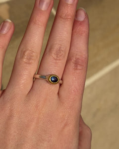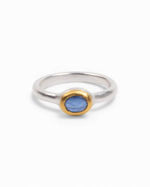 Zarter Ring aus 925 Silber mit blauem Saphir im Cabochonschliff. Der oval geschliffene Saphir zeigt ein schönes, ruhiges Blau und liegt sanft in einer schlichten Fassung. Die feine Ringschiene unterstreicht den Edelstein. 925 Silber- sowie Goldschmiede Krack-Stempel auf der Innenseite.