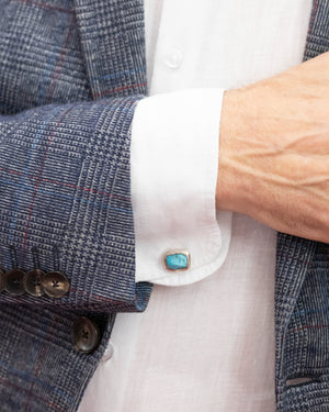 Manschettenknöpfe mit Türkis. Der von Hand gehämmerte Türkis hat eine unebene Oberfläche und eine intensive Farbe. Die Manschettenknöpfe sind aus 925 Sterling Silber gearbeitet und werden durch eine strukturierte 999 Feinsilberfassung ergänzt. Goldschmiede Krack- und 925 Silber-Stempel auf der Rückseite.