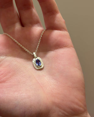 Dieser handgefertigte Anhänger aus 925 Silber zeigt eine organische Formgebung mit klarer Struktur. Ein facettierter violetter Tansanit von 0,83 ct ruht in einer Zargenfassung, die den Edelstein vollständig umschließt und sicher schützt. Die organisch-eckige Form des Anhängers zeigt eine fein strukturierte Nugget-Oberfläche, die einen natürlichen Kontrast zur klaren Brillanz des Tansanits bildet.