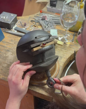 Dieser handgefertigte Ring aus 925 Silber trägt einen roten Hessonit-Granat von 6,98 ct. Der Edelstein ist in einer Zargenfassung aus 999 Feingold gefasst und sitzt mittig auf der sanft gewölbten Ringschiene. Der warme Goldton der Fassung bildet einen reizvollen Kontrast zum seidenmatten Silber und unterstreicht die kräftige, warme Farbe des Granats.