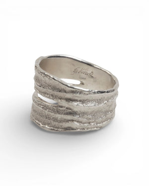 Dieser handgefertigte Spaltring aus 925 Silber zeigt eine markante Tarmac-Struktur. Die gespaltene Ringschiene verjüngt sich von oben nach unten und öffnet sich mittig zu einem charakteristischen Spalt. Die erhabenen Stellen sind leicht poliert, wodurch das Silber seidenmatt schimmert und die tiefe Oberflächenstruktur zusätzlich betont wird.