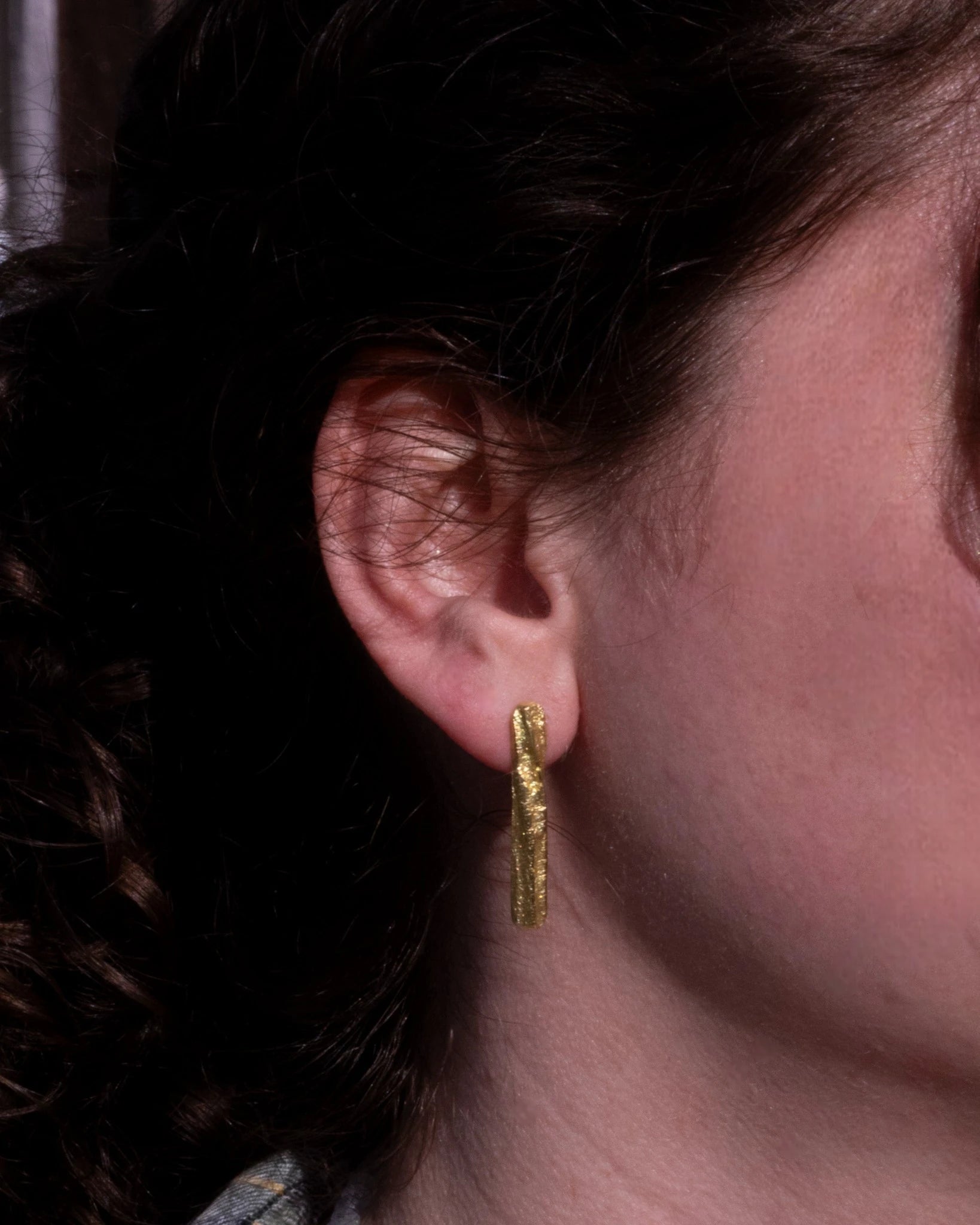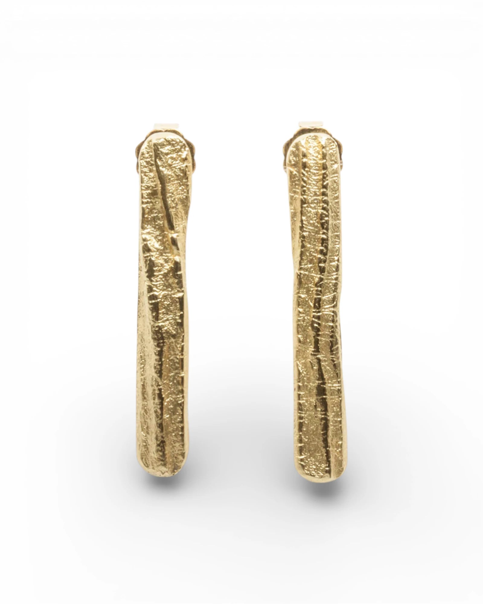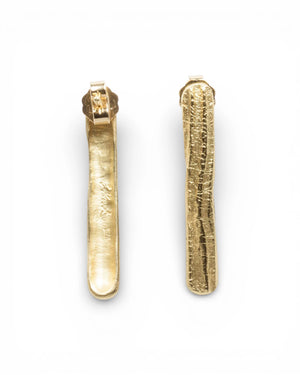 Diese handgefertigten Stab-Ohrstecker aus 750 Gelbgold bestehen aus geraden, schlanken Stäben mit markanter Tarmac-Struktur. Die raue, asphaltartige Oberflächenstruktur fängt das Licht auf besondere Weise ein und verleiht den Ohrsteckern einen modernen, kraftvollen Charakter. Die hochwertig gelötete Ohrmutter garantiert einen sicheren und guten Halt.